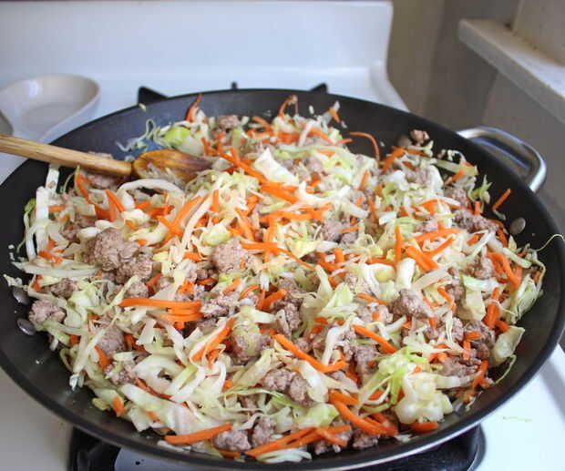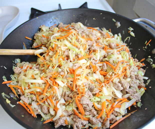 Agregar en el jengibre, ajo, repollo y zanahorias. Seguir revolviendo y cocinar hasta que la col es agradable y marchitas. Ahora baje el calor al punto bajo. :)