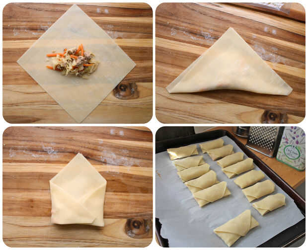Lugar un par de cucharadas de relleno justo en el centro la mitad de la envoltura. Poner el agua a lo largo de los bordes superiores. Doble la envoltura hacia arriba y sobre el relleno, presionar hacia fuera cualquier burbuja de aire y sellar los bordes juntos.