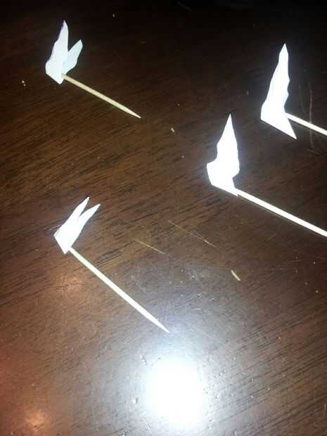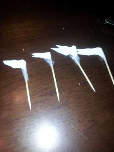 Deslice los escarbadientes dentro del doblez de la bandera. cinta bandera de th en la parte inferior para sujetar los palillos a las banderas.