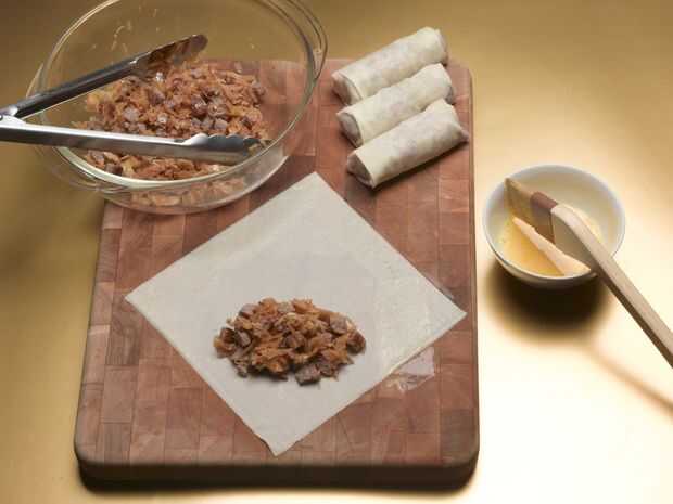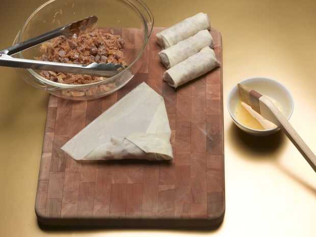 g) doble a la derecha como se muestra en la segunda foto. Asegúrese de que los extremos son sellados por el doblez para que aceite no puede entrar en el relleno mientras se fríe.