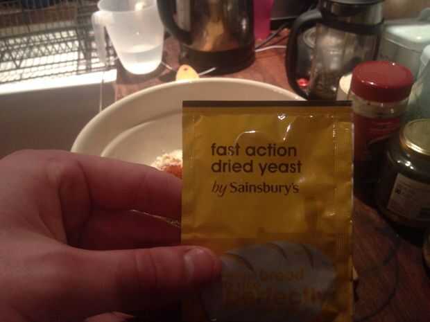 Cuadro 4. Añadir una bolsita de levadura en el recipiente y luego combinar whist todavía seca.