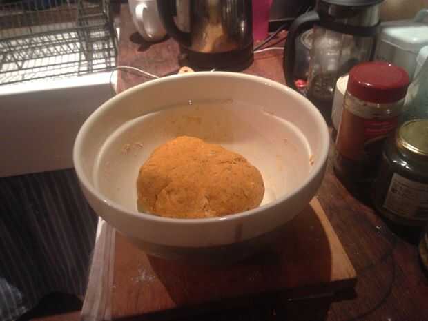 Cuadro 6. Cuando la masa ha sido reunida suficiente utilice sus manos, usted quiere realmente desarrollar el gluten en la masa pero siendo absolutamente áspero con ella. Recuerde que una buena masa deja un recipiente limpio.
