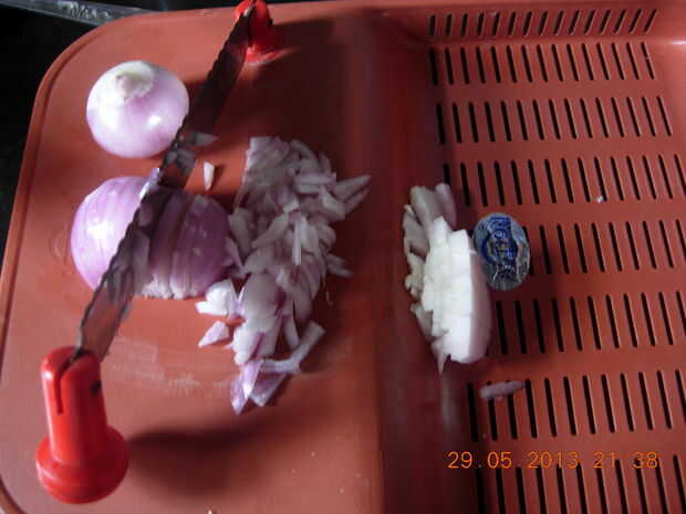 Como las patatas se reduce mientras tanto corta la cebolla.