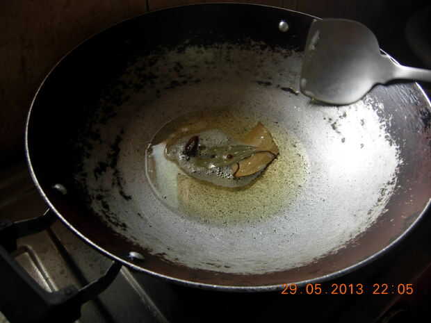 Tomar poco de aceite (para freír superficial) en una sartén. En poner 2-3 hojas de albahaca y un cardamomo.
