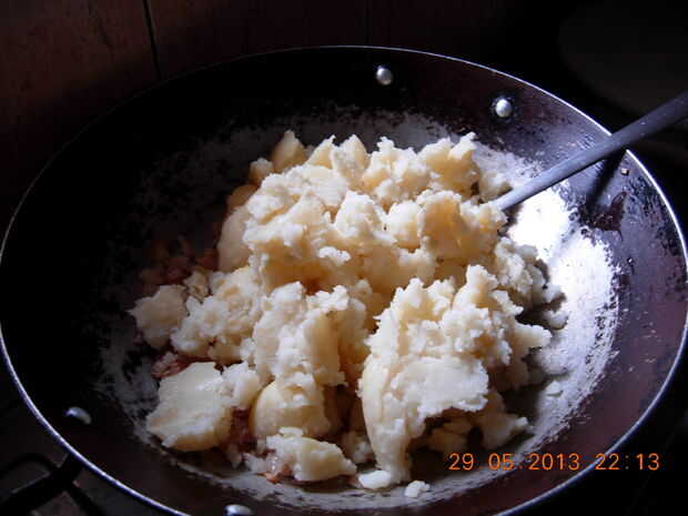Puré de papas hervidas y ponerlos en la sartén con las cebollas.