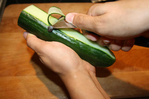 Llegar a rayas que deben parecerse a la imagen dos. Si el pepino llega a grande y te can´t pelan ya solo empezar desde el otro lado.