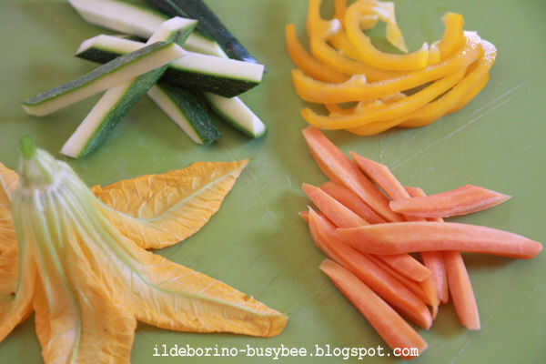 Cortar las verduras en tiras excepto las flores de calabacín.