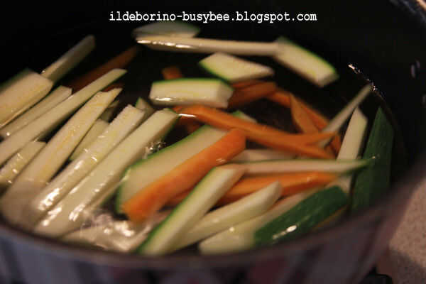 Poner agua en una olla pequeña poner a hervir, añadir una pizca de sal y escaldar los calabacines y las zanahorias durante 3 minutos, drenar y refrescado con un chorro de agua fría. Escurra y seque con toallas de papel.