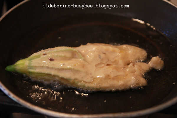 En el calor mientras tanto aceite vegetal en una sartén pequeña añadir el polvo de hornear a la masa, rebozar las flores de calabacín y freírlas, también freír la masa restante por la cucharada para obtener buñuelos poco va a servir con el pescado.