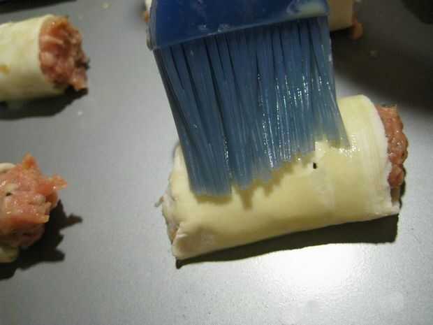 Aplique la mezcla de huevo/leche. Usar con moderación, el huevo y la leche se vuelve bastante oscura si piscinas alrededor de los rollos.