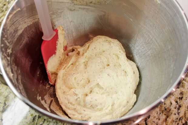 3. poner todos los ingredientes (los huevos primero) en el recipiente de tu batidora. Agite en bajo hasta que apenas se combinan los ingredientes húmedos y secos. Gire a la velocidad media-alta (8 de 10 en mi batidora Kitchenaid) y mezclar durante 8 minutos. Realmente se necesita ese tiempo para obtener la masa la consistencia adecuada. No adivine... ajustar el temporizador y a pie.