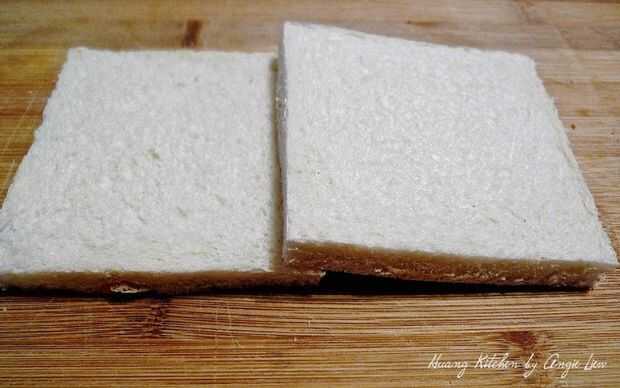 Coloque dos rebanadas de pan sobre la superficie de trabajo al lado del otro, ligeramente superpuestas una sobre otra para crear una gran pieza rectangular.