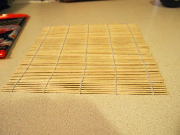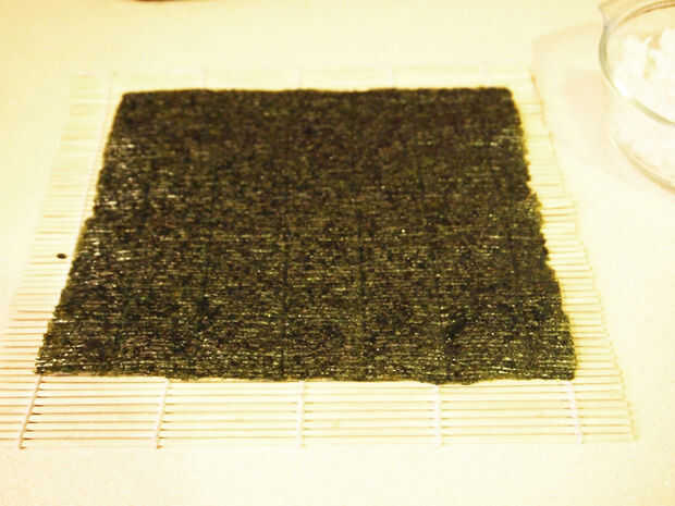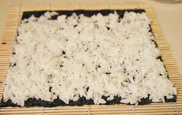 A continuación, coloque la estera de bambú y luego poner el trozo de alga sobre el tapete, con el lado brillante hacia abajo. Aunque algunas personas les gusta esperar hasta que el arroz se enfría completamente, me gusta difundir cuando está todavía caliente. Si el arroz se enfría y se está extendiendo con los dedos - que debe recibir sus dedos mojados para evitar que se pegue (pero no toque las algas con ellos). Yo personalmente uso una cuchara de plástico resistente que vino con mi olla para el arroz caliente. La cuchara es muy ancha y plana. Usted puede buscar en google para ver una imagen si te interesa. Usted podría probablemente también utilice una espátula o cuchara de madera para crear el mismo efecto. Por lo tanto, usted querrá extienda el arroz uniformemente, dejando sobre una mitad de una pulgada a una pulgada sin arroz en la parte superior de la hoja de alga marina.