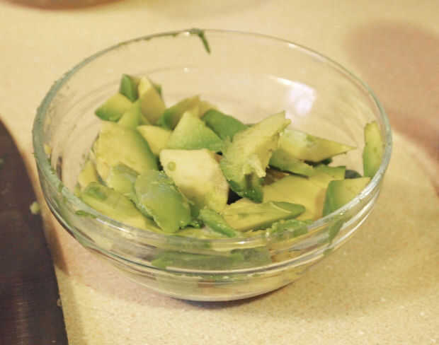 La primera cosa a hacer es hacer el arroz. Usar una olla arrocera es muy sencillo lanzar y dejar durante unos 20 minutos y se realiza. Vierte en una taza de arroz con 1 3/4 tazas de agua. Una vez hecho esto, permita que se enfríe un poco. Mientras que el arroz se cocina o enfriamiento, puede preparar el aguacate rebanado por la mitad, quitando las semillas y cortar trozos de tamaño mediano para usar como relleno.