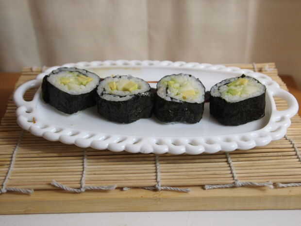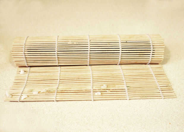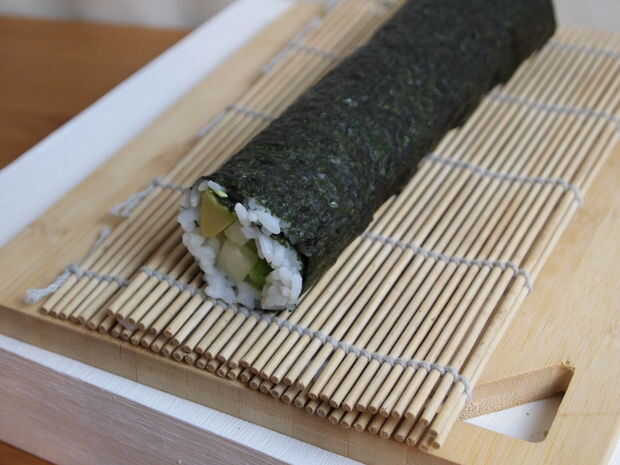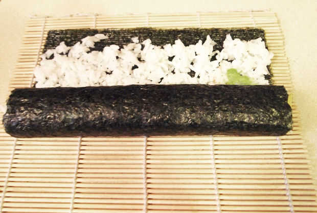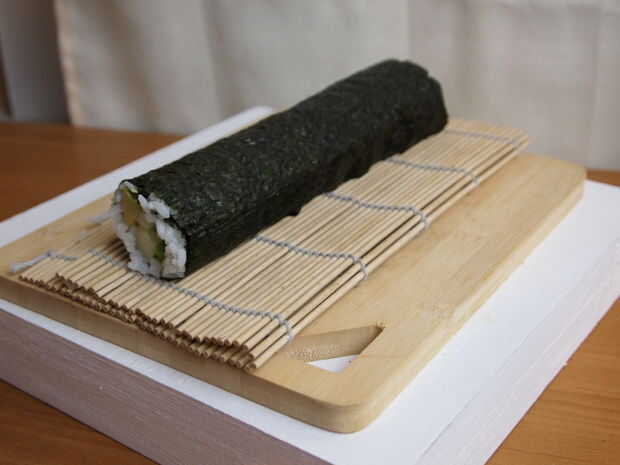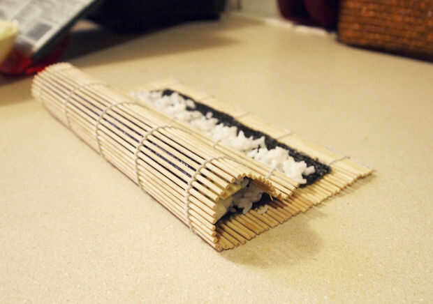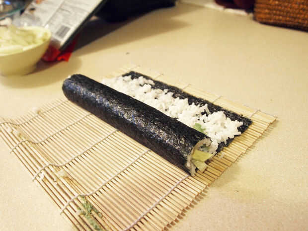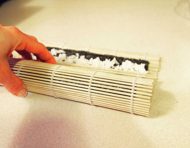Entonces, personalmente muevo el nori y todo en él hacia la parte inferior de la estera. Entonces, hacer un rollo grande con el tapete y suavemente, sino apretar firmemente mis manos alrededor de la estera con el nori y todo dentro. Una vez que hago eso, me quedo con mi rollo, pero todavía hay unas cuantas pulgadas en exceso que deba ser rodado. Luego sacar el tapete y poner hacia abajo otra vez. Luego, el rollo de nori que aún no está hecho y tire hacia atrás hasta la parte inferior de la estera y utilizar la estera para completar el rollo desde allí. Debe firmemente pero con cuidado la forma el rollo con la estera alrededor de él por lo que es agradable y firme.