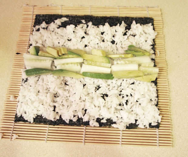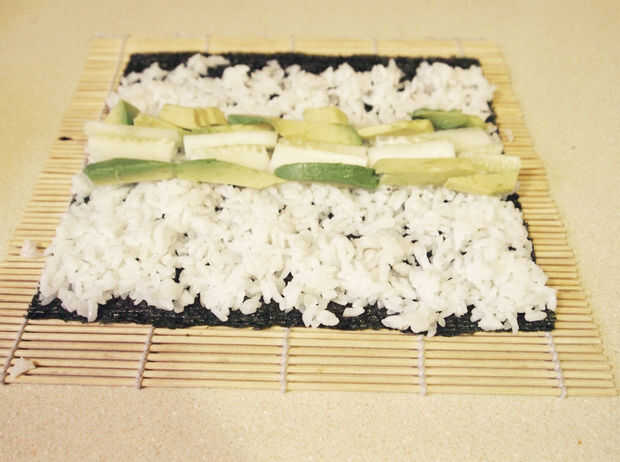 A continuación, coloque los otros ingredientes (aguacate, pepinos, etc.) en el centro del nori sobre la esterilla. Trate de no hacer demasiado gruesa (mina eran un poco demasiado espeso en las fotos aquí). Entonces, me gustaría añadir un poco del esmalte en el interior de mis rollos - soja entonces no hay necesidad para sumergir cualquier cosa. Solo eche dos tiras de la misma en sobre los ingredientes del mediados.