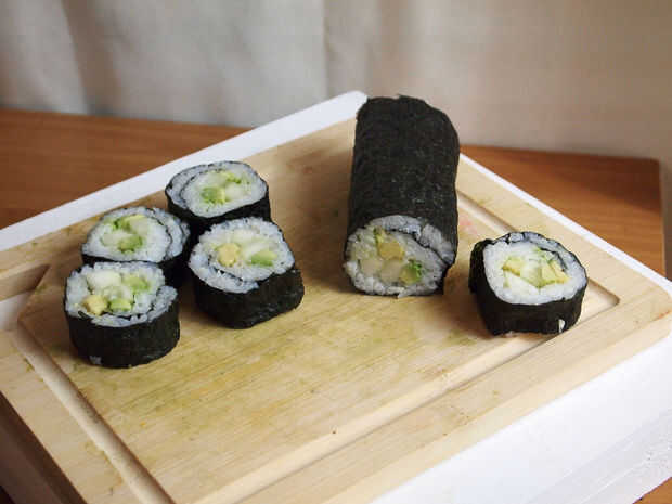 Una vez hecho esto, tendrás un bonito rollo largo terminado y listo para que usted pueda cortar. Saca un cuchillo y cortar el rollo en pedazos. Limpiar el cuchillo entre corte, porque puede obtener pegajosa con arroz o relleno y luego se pegará. Una vez hecho esto - sirven como es o con alguna inmersión salsa, glaseado de soja, salsa de soja o wasabi. ¡ Disfrute!