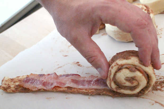 Suavemente desenrollar el rollo de canela completamente, coloque una lonja de tocino precocido en la parte superior y volver a rodar. Humedecer el extremo de la cola del rollo Canelo seguro en sí mismo y dejar de desenrollarse.