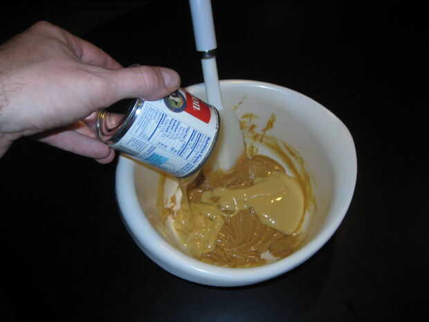 Ahora añadir la leche condensada y el calor otra vez por la misma cantidad de tiempo antes de y revuelva otra vez a una consistencia uniforme.  Si no haces los pasos en este orden, el SCM y mantequilla no mezclan derecha y obtendrá una consistencia granulada.
