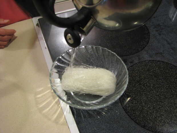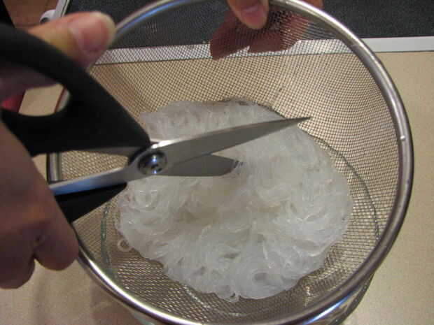 Coloque todo el paquete de fideos fideos en un bol pequeño y cubrir con agua hirviendo. Remojar en el recipiente de agua caliente durante un par de minutos. Luego Escurra los fideos en un colador sobre el fregadero. Corte los fideos escurridos en trozos de aproximadamente 1 pulgada. Puede utilizar tijeras mientras estaba en la coladera, o usted puede cortarlas en una tabla de cortar con un cuchillo.
