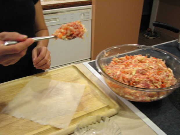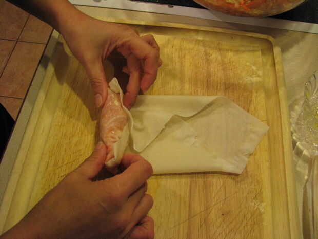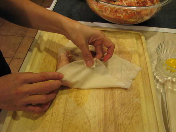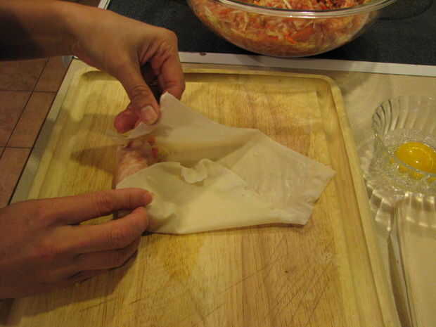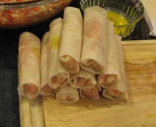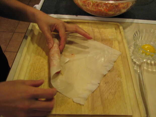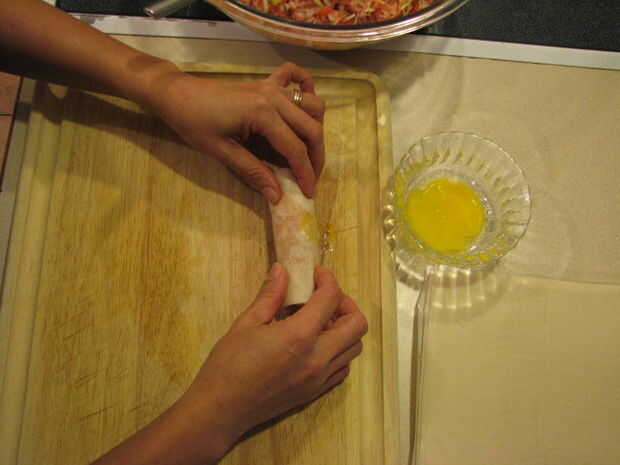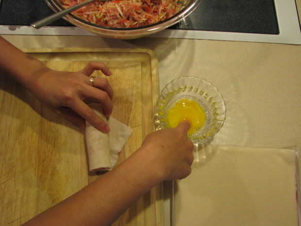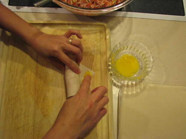 Una vez que llegue el momento, puede continuar llenar y rodillo conchas restantes (si no lo ha hecho), mientras se cocina 4-5 rollos de huevo en un momento.