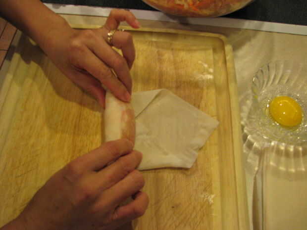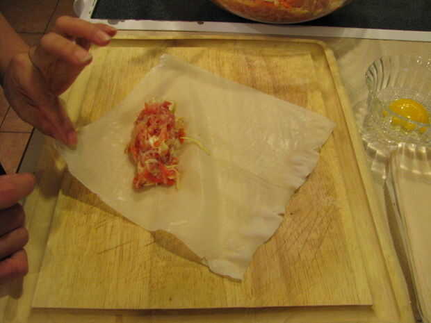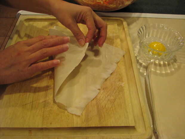 Colocar la cucharada de mezcla cerca de centro de la hoja, una cuarta parte de la forma desde la esquina más cercana a usted. Doblar la esquina sobre la mezcla, meta en el centro y rodar hacia adelante ligeramente. Doblar a la derecha hacia el centro de la hoja, luego doble la esquina izquierda en el centro. Meta y apriete ambas esquinas hacia adentro, mientras rueda hacia la esquina restante. Deja sólo una pequeña porción de la esquina restante de la hoja expuesta. Sumergir el dedo en la yema de huevo y aplique en el borde de este rincón. Acabado laminado y sello con final yolked. Pila de rollos.