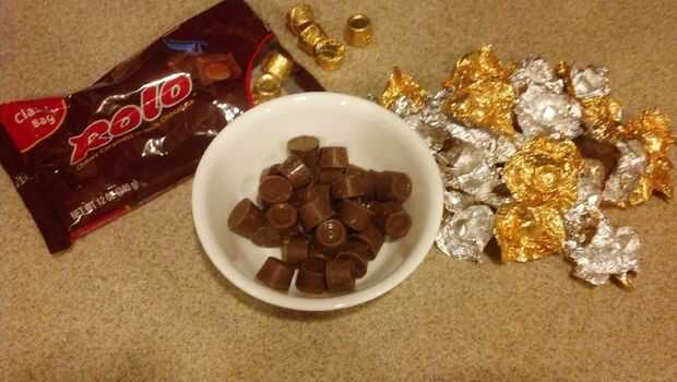 Mientras que la masa se enfría en el refrigerador, puedes empezar a desenvolver aproximadamente 48 caramelos Rolo y coloque en un tazón.