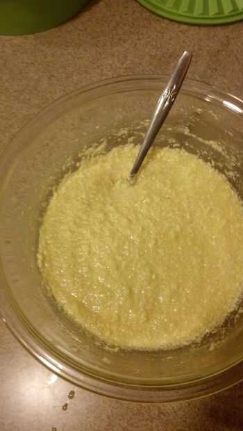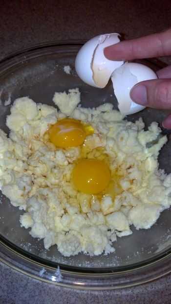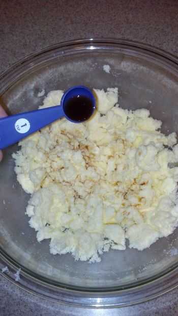 a la mezcla de mantequilla y el azúcar le agregas 2 cucharaditas de vainilla y 2 huevos. Usted quiere mezclar bien hasta que todos los trozos de mantequilla grandes desaparecen. Sin embargo, la mezcla todavía aparecerá ligeramente grumosa.