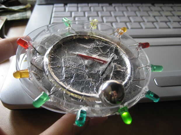 rodar una bola de metal en un recipiente de plástico, haga las conexiones eléctricas y ver como los LED encienden en sucesión!! OoooOoo