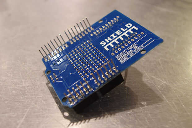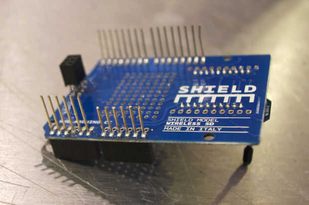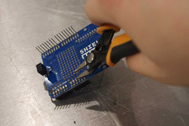 Recortar las patillas de la cabecera hacia abajo aproximadamente 1/8" y quitado totalmente el conector ICSP del escudo (resultó para ser innecesario para nuestras necesidades).