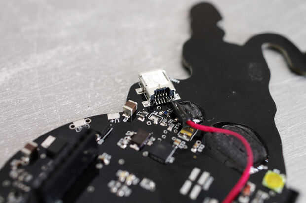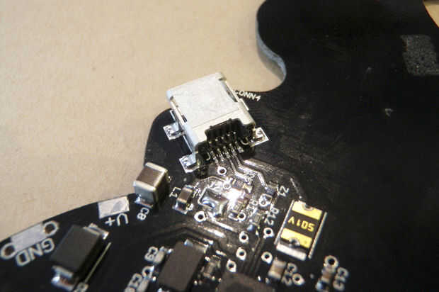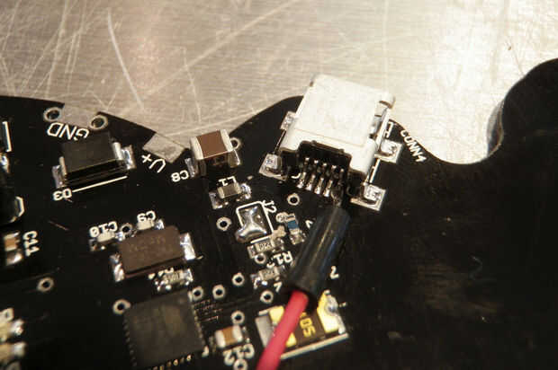 En última instancia, (es decir, Randy) esperé hasta que nadie más (es decir, Amanda) estaba prestando atención y soldado muy rápido con el conector USB. El problema fue solucionado por lo tanto mientras que Amanda se distrajo por su "golpe máquina de cortar." Este fue un caso en el cual el bucle repetitivo de las canciones de Beach House probó útil al equipo.