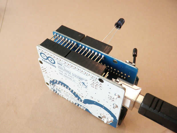 Para controlar el volumen en el estéreo decidimos utilizar Arduino como mando de la radio. Esto era sólo una cuestión de copiar el comando de volumen-para arriba del mando a distancia existente en el Arduino y jugando por un LED IR.