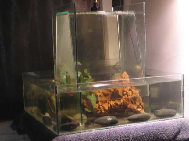 El montaje de la válvula en la parte superior es un adaptador de manguera de jardín con una válvula de refrigeración schreider enroscado en él. También es posible alimentar un tubo semirrígido de plástico a la parte superior del acuario superior y vacío a través de este. Cuando el agua alcanza la parte superior, cierre la bomba de vacío y retire el tubo. El agua permanecerá en el depósito superior como lon el nivel tan inferior cubre la entrada al tanque superior.