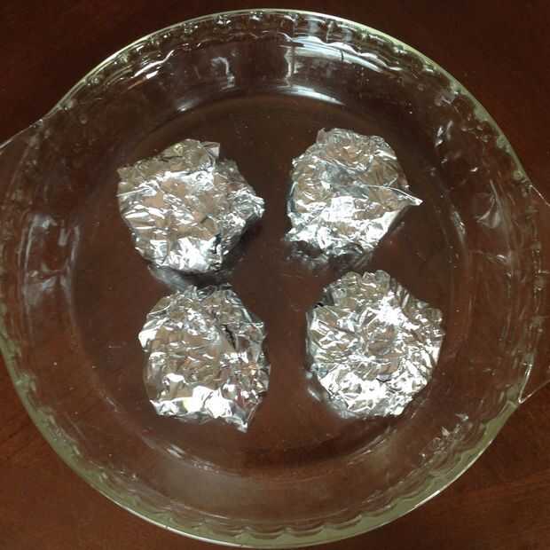 Envolver la cabeza con papel de aluminio papel rayado (si no que, cubra el corte con papel de pergamino y envolver con papel aluminio para evitar tocar la hoja de ajo)