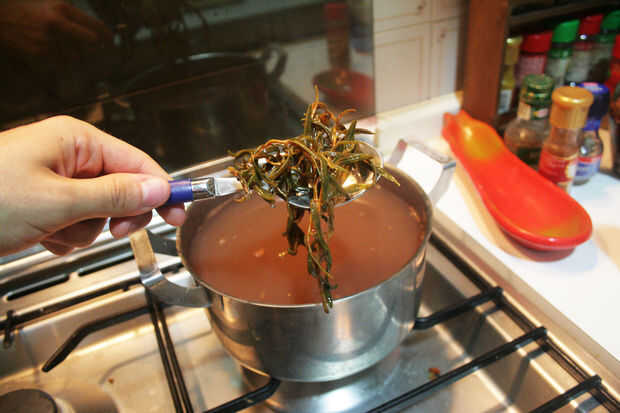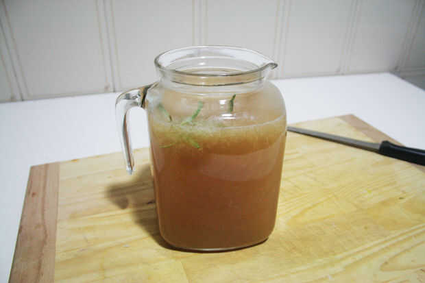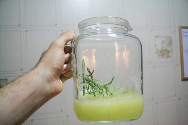 Así, estamos reemplazando un cocido con un tallo nuevo de Romero, que podemos poner directamente en la jarra con jugo de limones.