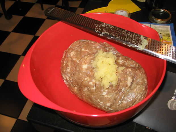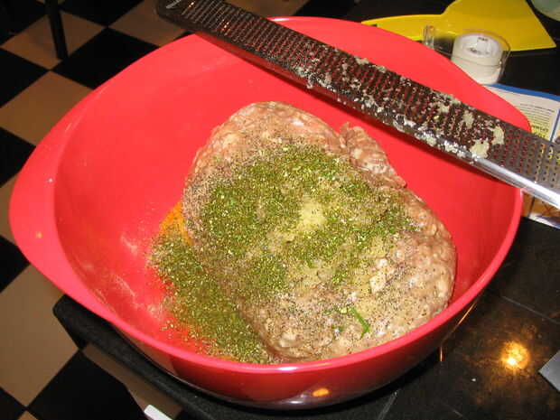 En un tazón grande, Agregue ajo rallado y romero seco a unas cuantas libras de pavo molido. Turquía comienza lean bastante, pero si quieres super magro, de pechuga de pavo de tierra.