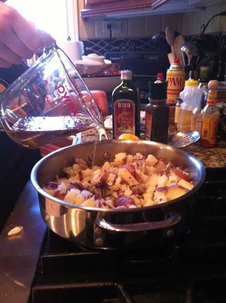Agregar las papas a la cacerola y al calor por 1 minuto. Agregar la mezcla de aceite de oliva que acaba de hacer a la cacerola y agregue las papas y el aceite de oliva junto durante 1-2 minutos.