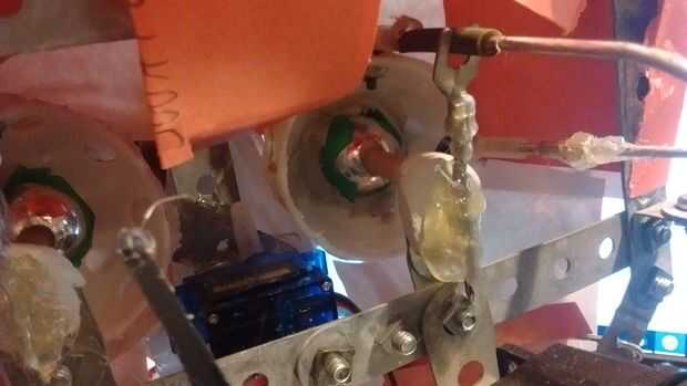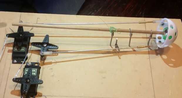 Un montaje de varillas de toma de bola para coches RC fue montado en cada cuerno motor y uno en cada eje del ojo de la bola (ver imagen) y una varilla para coches RC fue cortado para cada ojo (total 4). La barra asignada para mover cada ojo en el eje y tuvo que doblarse un poco para aumentar el rango de movimiento y movilidad. Esto completa el montaje inicial de los ojos.