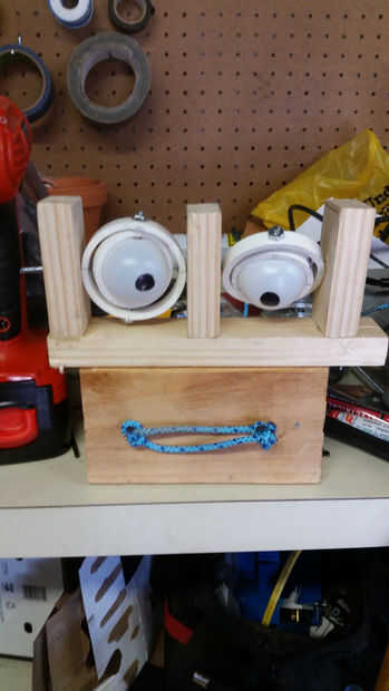 Para hacer la toma de bola, en primer lugar, el receptor de la pelota fue fabricado con la botella de soda. Una sección de la botella de plástico de soda fue cortada envuelto alrededor de una canica de vidrio y sujeta con las abrazaderas en C mientras que fue utilizado un soplete para calentar y para formar el plástico alrededor del mármol. Se tuvo cuidado especial para facilitar el retiro de la canica de vidrio después de refrescar. Usando un par de diques, el plástico fue cortado para permitir la rotación completa del ojo cuando varilla de mármol plástico. Tuvo varios intentos de hacer que dos receptores de plástico. Botellas de refresco bueno son abundantes. A continuación, el plástico mármol recibió un agujero perforado en el tamaño de la varilla de madera. La varilla entonces fue pegada en su lugar con pegamento para madera para fijar el plástico mármol. Los receptores de la botella de plástico fabricados deben ser capaces de ajustar el encendido y apagado el mármol plástico. La pelota de golf de plástico whiffle fue cortada por la mitad con una dremmel. Los bola-los receptores fabricados (pedazos de botella de soda) fueron Unidos en el centro de la bola whiffle Masilla epoxy. Esto se hizo para cada ojo.
