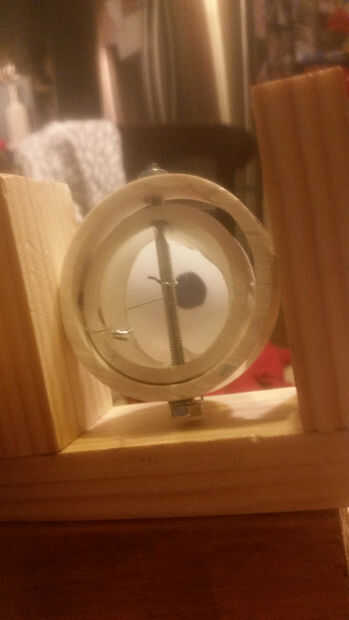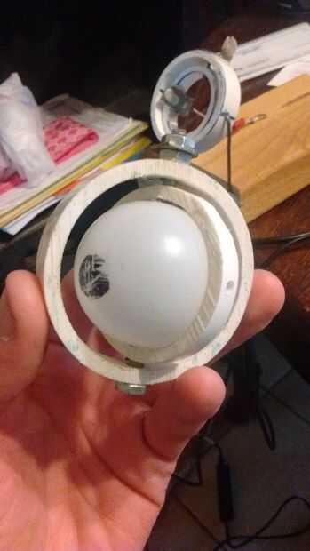 Empecé con el conjunto de los ojos. Esta es la parte más difícil en mi opinión. Se escogió el método de toma de bola el gimble 2 ejes, pero ambos eran considerados y prototipado. La toma de bola permite la adición de párpados sin muchos problemas. Gimble también creada problemas con el rango de movimiento; uno de los motores tendría que poner en una plataforma que puede moverse con el ojo que causa la necesidad de motores más potentes. La bola del ojo se construye de una pelota de golf de whiffle cortar por la mitad (una pelota de ping-pong podría haber sido usada). La toma de bola fue creada con una botella de refresco, una canica de plástico y una varilla de madera.