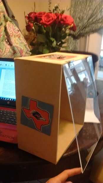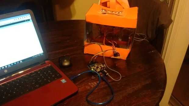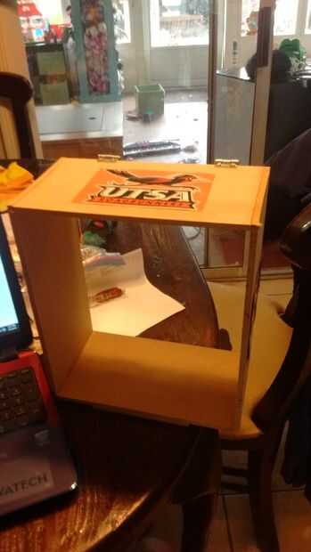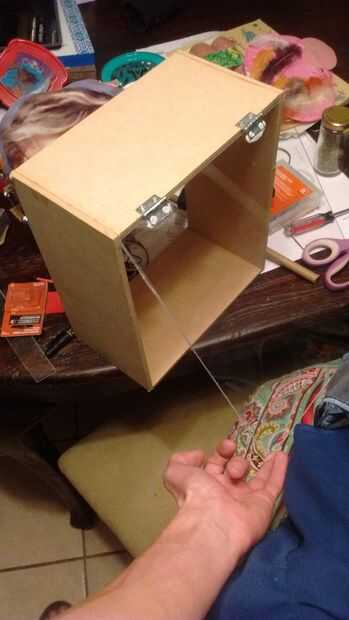 Finalmente, se hizo una caja de MDF con un respaldo claro de acrílico. Las dimensiones son de 12" de alto por 9.5" de ancho por 5" de profundidad. (Debe haber sido un poco más.) La madera fue cortada con una sierra de calar y ensamblada con grapas y pegamento de madera. El acrílico fue cortado con una herramienta de corte de acrílico para evitar agrietamiento plástico. Las bisagras se atornillan a la madera y algunos masilla epoxi se utiliza en el lado acrílico debido a interferencia creada por los tornillos. Esto crea un recinto para la cara y esconde la mecánica. También permite acceder fácilmente a los cerebros de la cabeza.