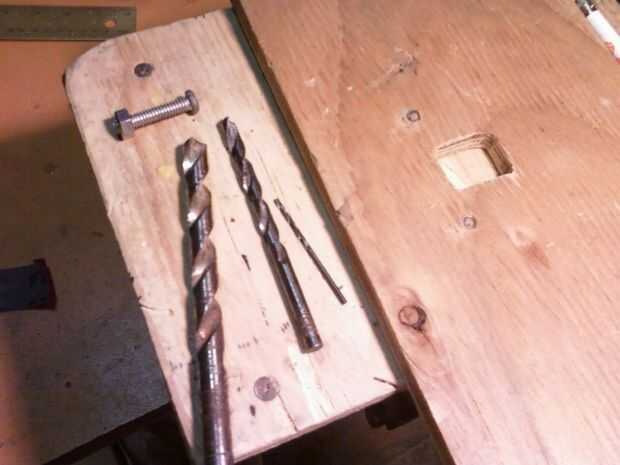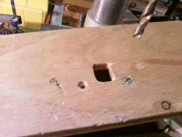 Taladré un agujero de arranque con la broca más pequeña, perforados a través con el pedacito de taladro medio (0,25") y entonces perforado 0,25" profunda con la broca más grande, para que la cabeza del perno ras debajo de la superficie de la placa de montaje. De nuevo, utilice cualquier dimensiones le parezca que corresponden en relación con el hardware que desea utilizar.