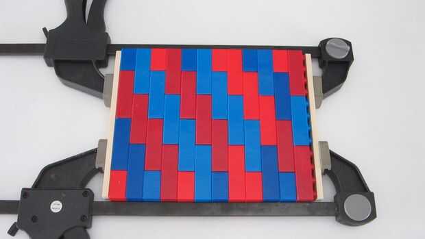Para asegurar que los bloques se pegan juntas uniformemente puede ayudar a sujetarlos entre dos pedazos de madera. Sin embargo esto es totalmente opcional.