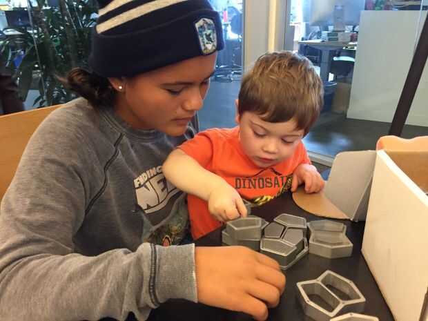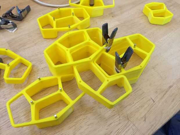 La introducción de imanes como una articulación flexible proporciona varias características: mediante el uso de los imanes pequeños de 1/8" de diámetro, las conexiones se podrían hacer solamente en los imanes que mantienen las piezas en el módulo, la conexión de presión proporciona una satisfacción retroalimentación al usuario cuando las partes se reunieron y con estas facilidad de conexión, en lugar de moler hacia fuera de las aberturas de aluminio de 1" de espesor , la combinación de aluminio 3/4"+ 1/4" de aluminio pieza superior no sólo elimina el tiempo de fresado, simplificado el número de piezas únicas a dos formas básicas - la barra y el reloj de arena - mientras que proporciona la variación a través de tres diferentes piezas superior - formas similares de la barra y de reloj de arena + el hexágono completo módulo. Este paso también desarrolló un sutil pero importante dar forma a las esquinas afiladas eliminar módulo básico y la racionalización de las formas alrededor de los imanes. En esta etapa el tamaño de los módulos también fue probado y calibrado con escala arquitectónica - prueba unidades hacia fuera en 1/16", 1/8" a resolver en última instancia en una escala de 1:20 como esto dio el tamaño y a las unidades en la mano. Después de probar hacia fuera con comentarios de los usuarios, era tiempo para la producción.