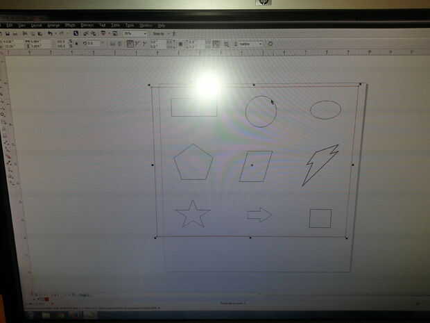 utilizar varias herramientas de formas en coreldraw para dibujar otras formas dentro del cuadrado/del rectángulo material, yo lo hice: rectángulo, círculo, elipse, Pentágono, paralelogramo, letra J, estrella, flecha, cuadrado