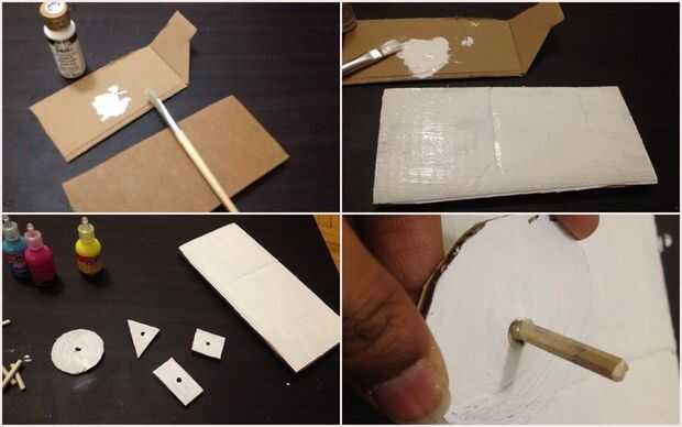 Tome un pedazo de cartón en todas las formas (círculo, cuadrado, rectángulo, triángulo) y pegamento caliente el palillo de la tajada individualmente en el centro del agujero.