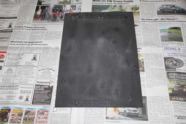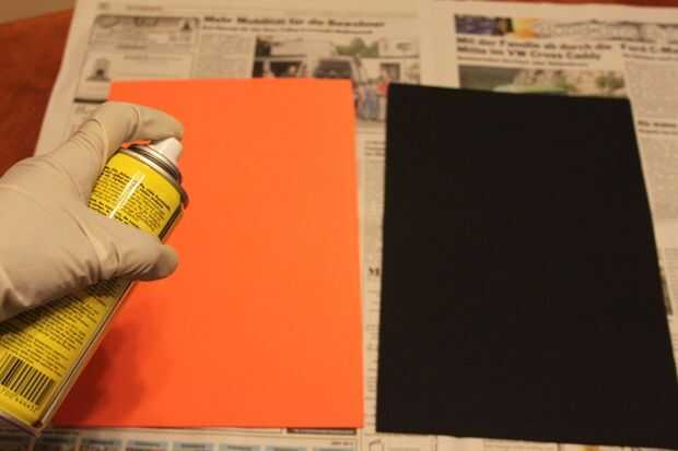 Agite muy bien el aerosol Uhu y rociarlo a una hoja de la espuma (negro) y pegar la otra hoja naranja sobre él. He puesto un grueso libro pesado encima durante un tiempo. Dentro de un par de minutos tanto las hojas se pegan bien juntos.