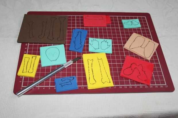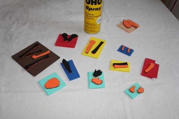 Copiarla sobre otra vez desde el papel a los pedazos pequeños de goma espuma. La segunda imagen muestra en qué color va a cada parte a ser.  Nunca mantenga las piezas cortadas en la espuma y tomar la salida de línea ya que es ligeramente más grande que la ya cortan del esqueleto. Que no fije en correctamente.
