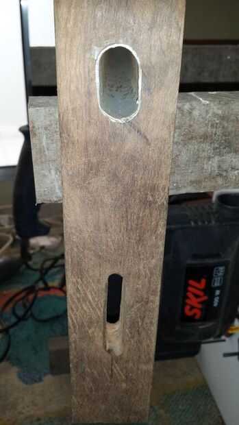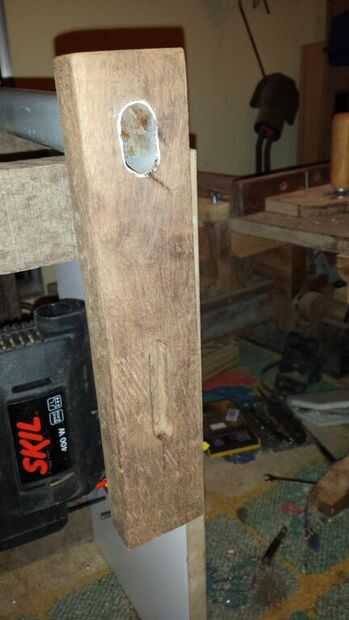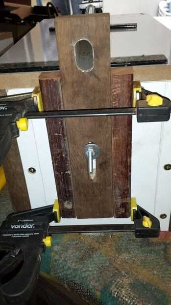 Para fixação braço horizontal mesa de na, cortado foi um em de la furado pedaço da ripa de Imbuya e um dos lados para o encaixe tubo ovalado. También foi feito um rasgo no movimento de para permitir o de suporte vertical braço.