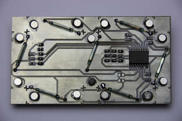 En principio, cada dígito consisten en siete interruptores operados magnéticamente (reed switches) cuyos Estados son leídas simultáneamente por el IC PCF8574T. Para hacer los segmentos individuales de un palo de dígito en el lugar correcto a través del tablero de madera, cada interruptor de láminas es acompañado por dos imanes de 4 x 2 mm que actúan como un "ancla" para los dos imanes de 4 mm correspondiente del segmento madera. Aquí, lo reed switches están alineados centro de manera un cierre del interruptor será directamente bajo el imán del centro de 5 mm del segmento madera. Puede encontrar más información sobre reed switches mediante la lectura de este documento.